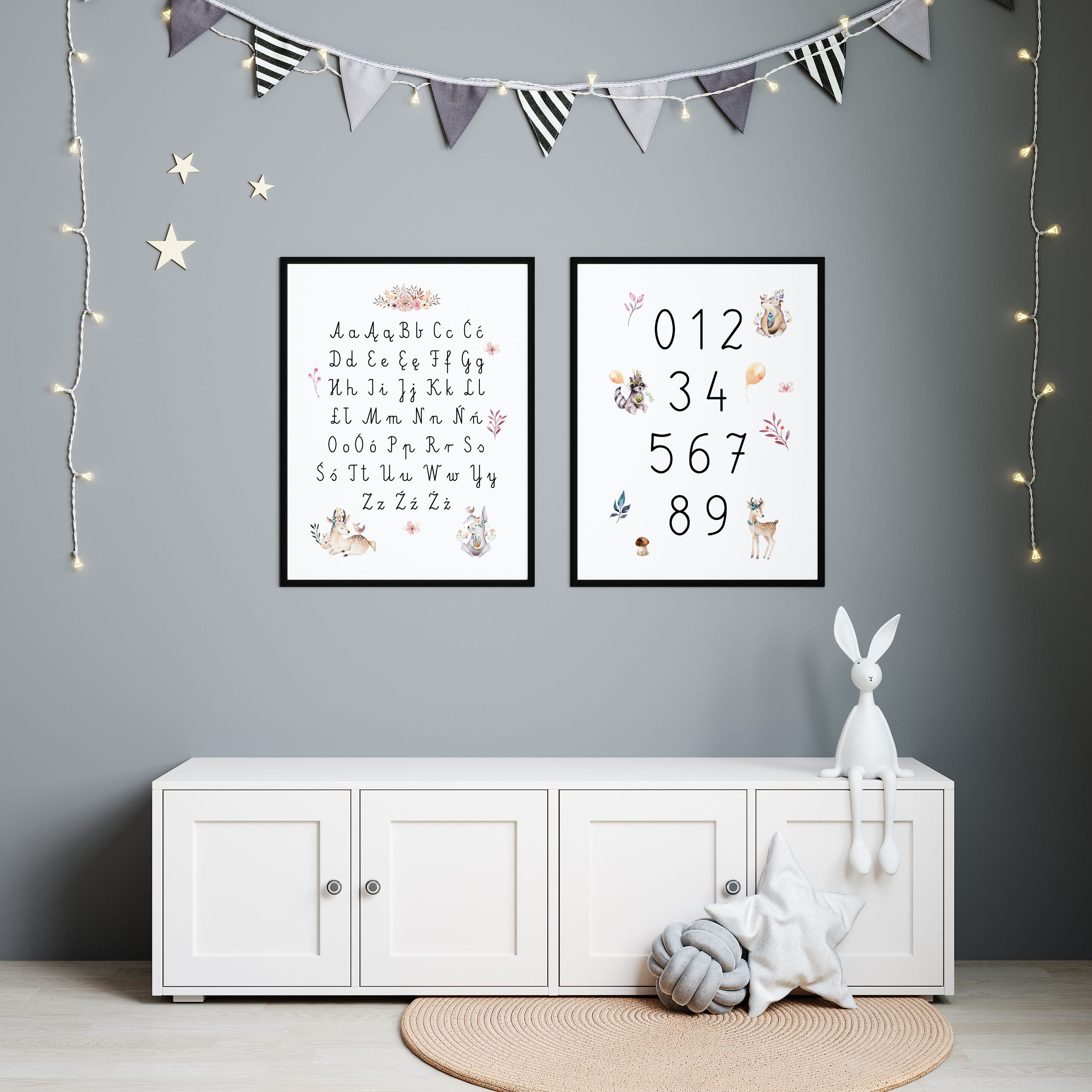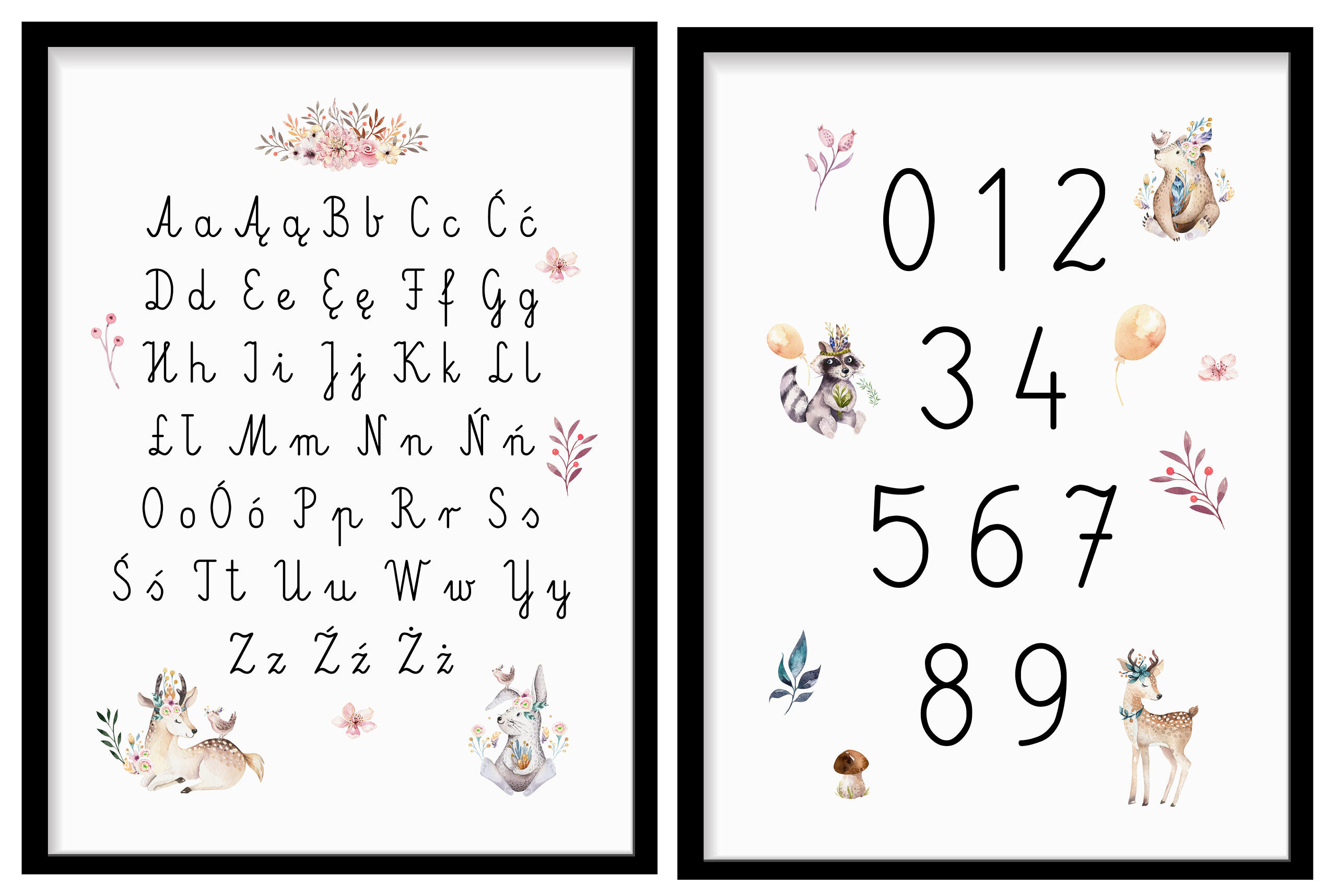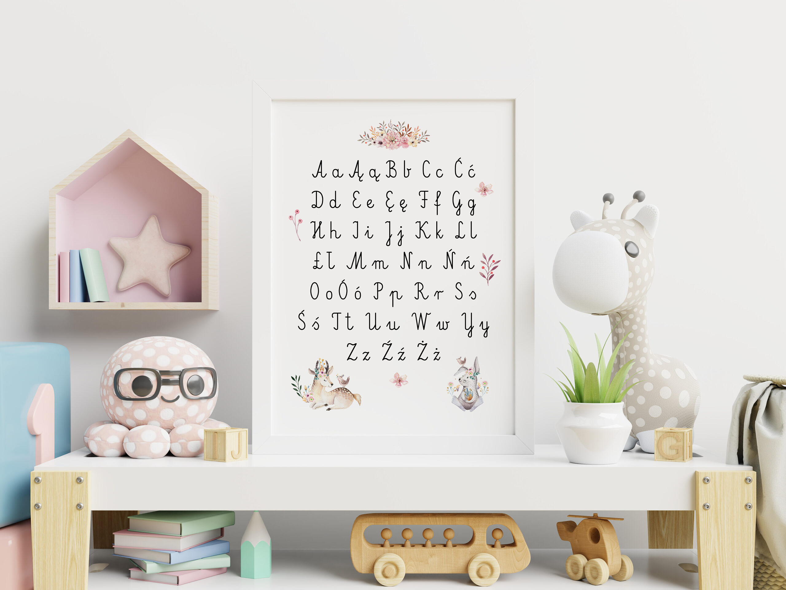 Plakat Alfabet (Abecadło): To nie tylko nauka literek. To piękna grafika, na której centralne miejsce zajmuje urocza sarenka w wianku z kwiatów. Pisane litery polskiego alfabetu są czytelne i pomagają dziecku w pierwszych próbach czytania.