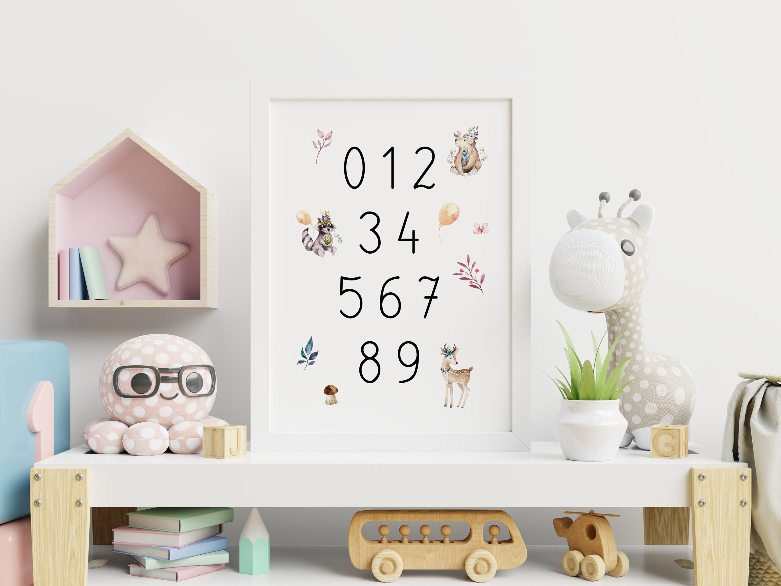 Plakat Cyfry (0-9): Nauka liczenia staje się przyjemnością, gdy towarzyszą jej leśne motywy. Delikatne kolory (beże, brązy, zieleń) działają kojąco i nie przebodźcowują dziecka.
