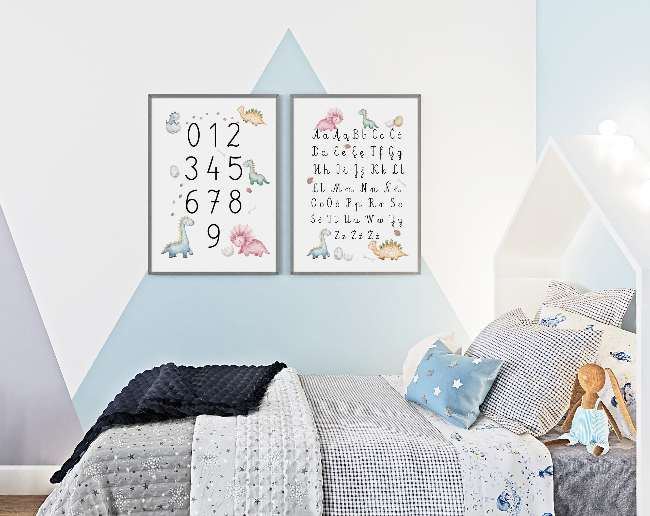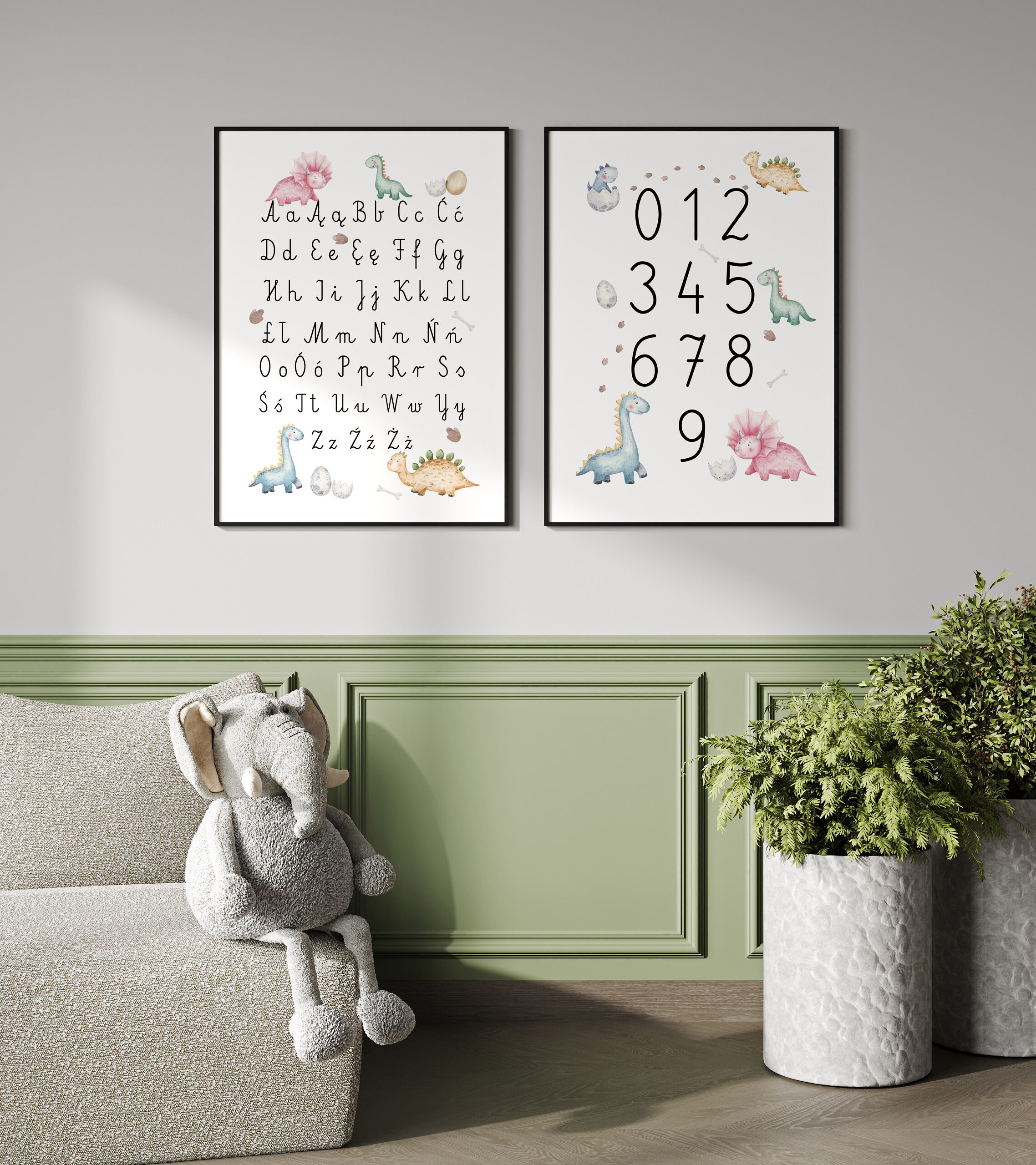 Plakaty edukacyjne Dinozaury składają się z alfabetu pisanego oraz cyfr. Zestaw ten pomoże każdemu dziecku szybko przyswoić litery i cyfry. Są po prostu pomocą dydaktyczną. Stanowią również doskonałą ozdobę w pokoju dziecka. To nie tylko gustowny dodatek, ale również dekoracja pobudzająca dziecięcą wyobraźnię.