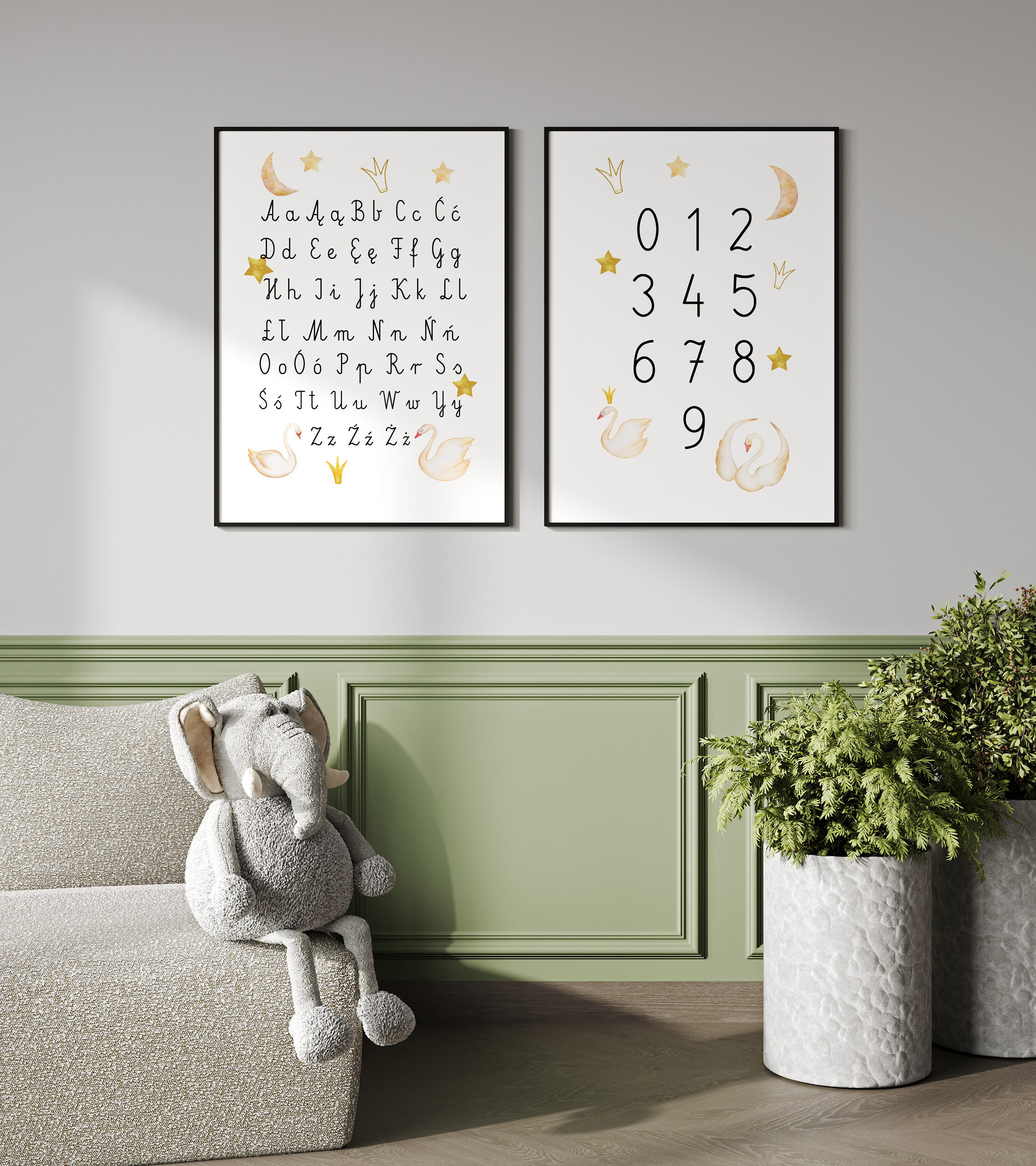 Plakaty edukacyjne Łabędzie alfabet i cyfry składają się z alfabetu pisanego oraz cyfr. Zestaw ten pomoże każdemu dziecku szybko przyswoić litery i cyfry. Są po prostu pomocą dydaktyczną. Stanowią również doskonałą ozdobę w pokoju dziecka. To nie tylko gustowny dodatek, ale również dekoracja pobudzająca dziecięcą wyobraźnię.