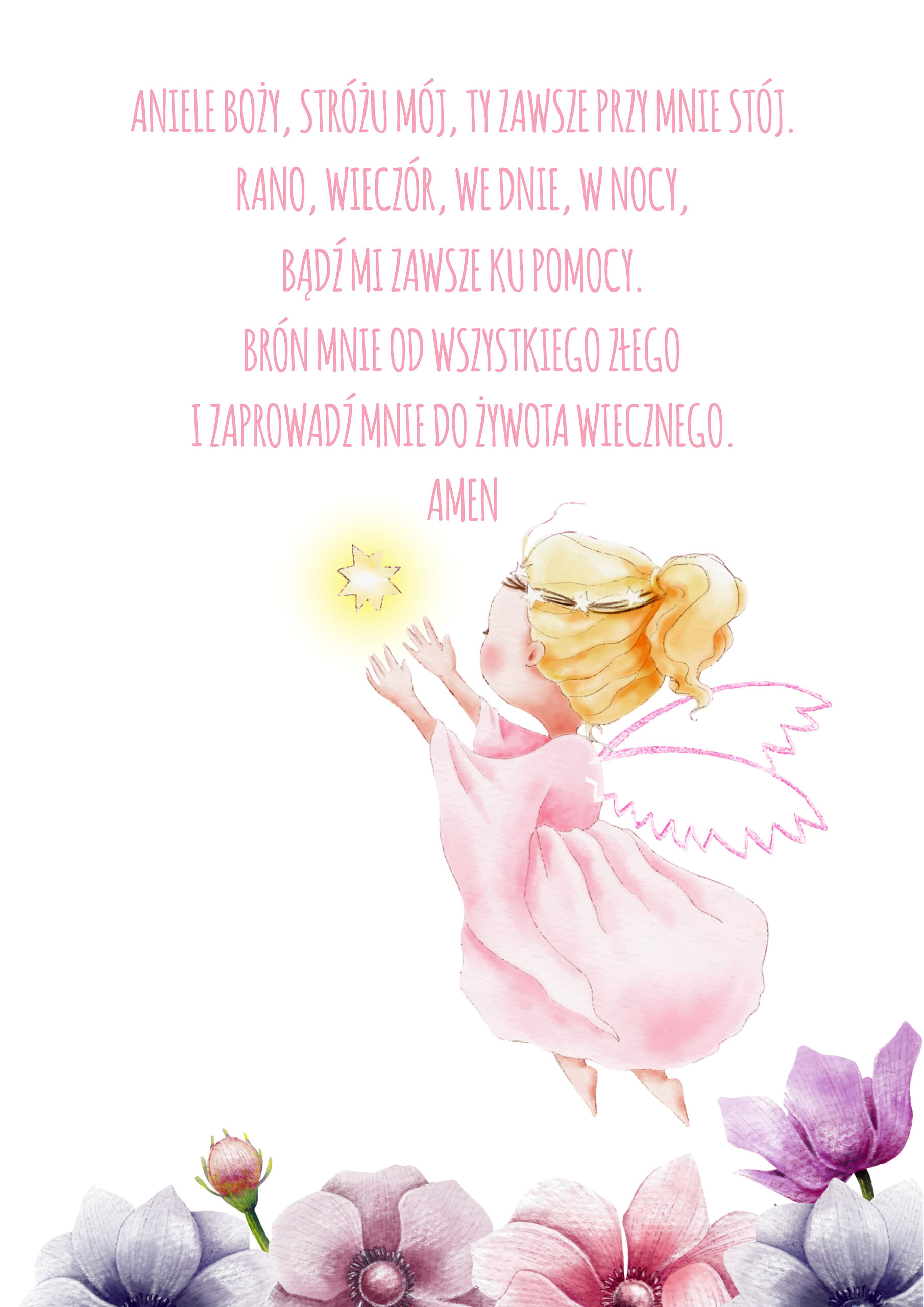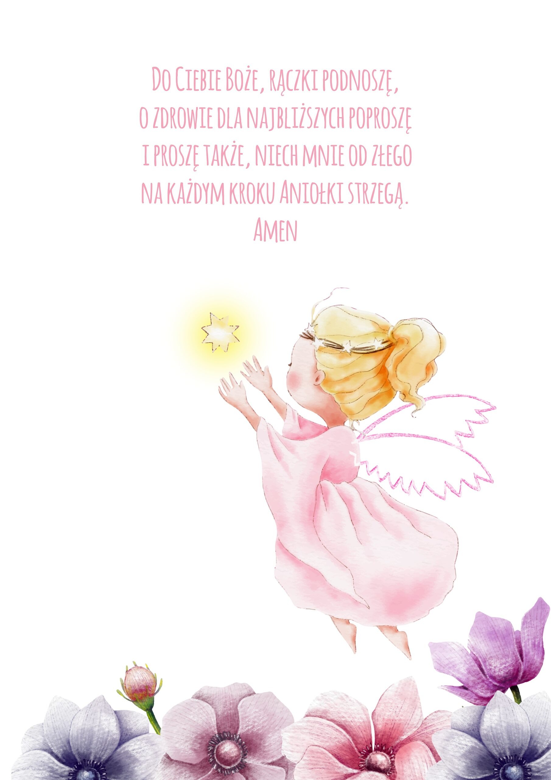 Plakat z Modlitwą: Grafika z Aniołkiem sięgającym do gwiazd oraz tekstem pierwszej, dziecięcej modlitwy: „Do Ciebie Boże, rączki podnoszę, o zdrowie dla mamy i taty proszę…”. To klasyczny tekst, który każdy z nas pamięta z dzieciństwa.