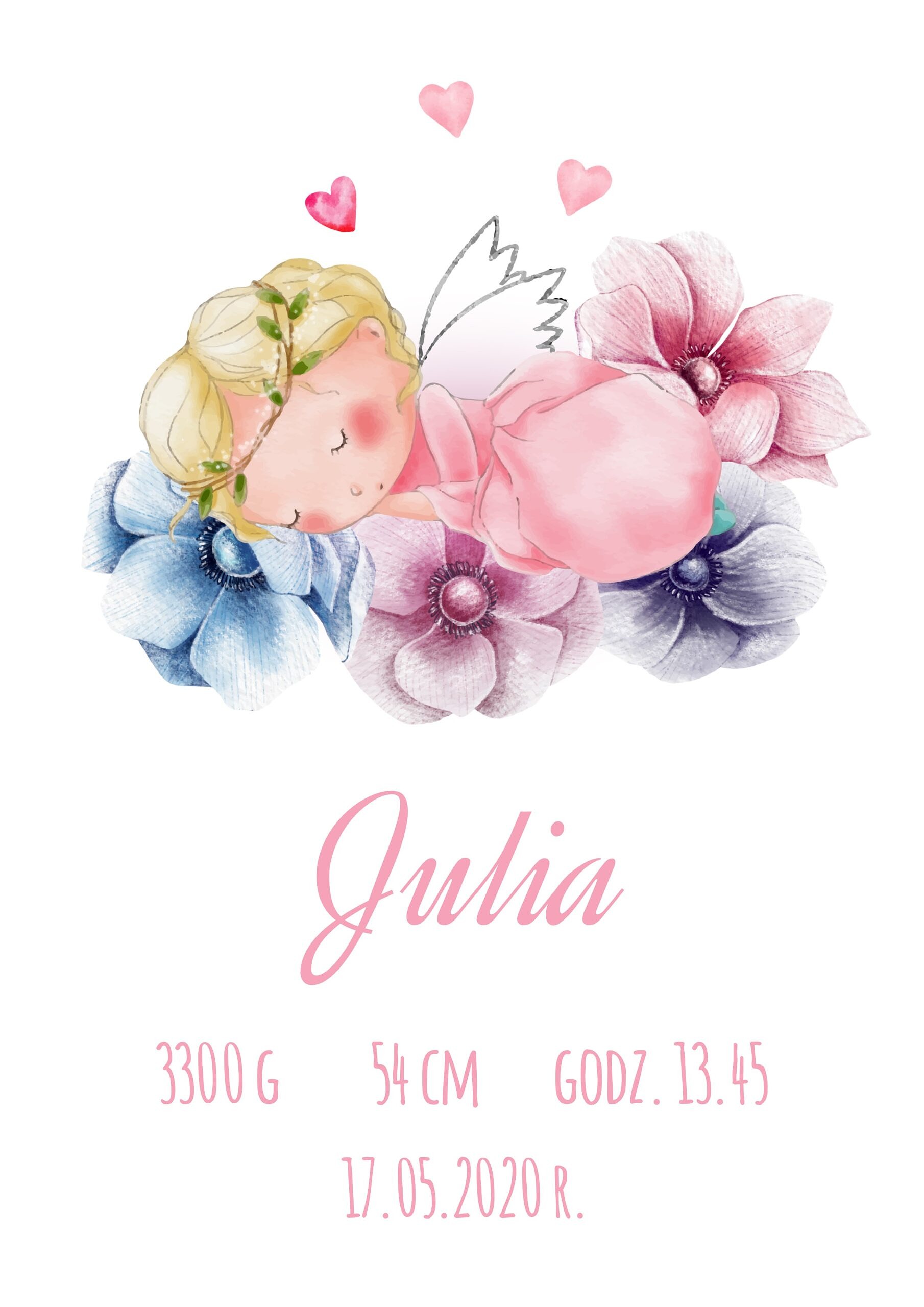 Metryczka (Personalizowana): Słodki śpiący aniołek w otoczeniu kwiatów. Tutaj umieścimy najważniejsze dane z dnia narodzin: Imię dziecka, datę, godzinę, wagę oraz wzrost. To najpiękniejszy sposób na upamiętnienie chwili przyjścia na świat.