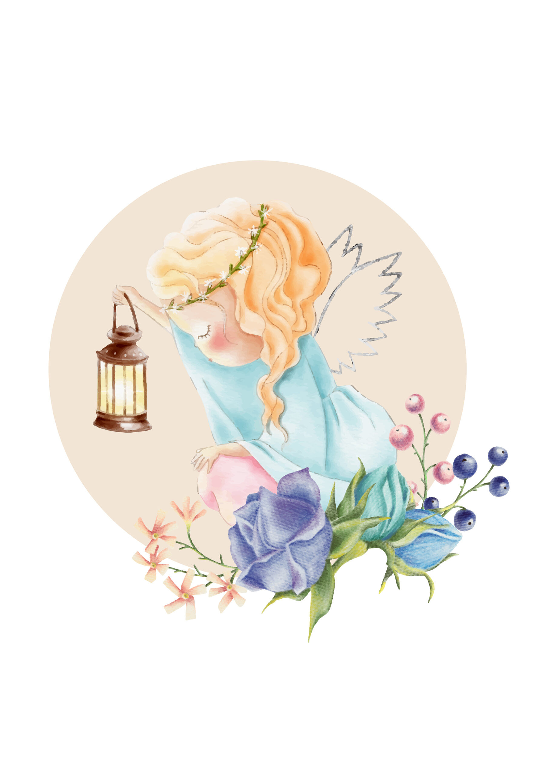 Anioł Stróż z Latarnią (Środek): Centralny obrazek przedstawia Aniołka niosącego latarnię. To piękny symbol wskazywania drogi, opieki i światła, które ma chronić dziecko.