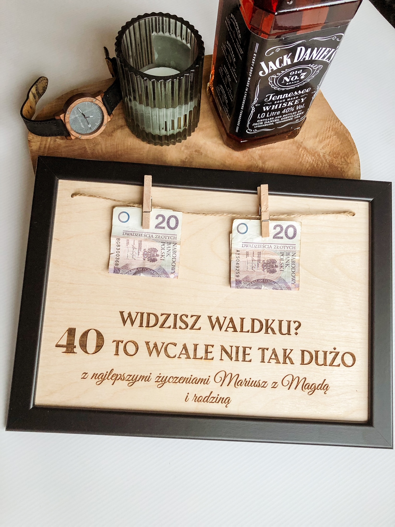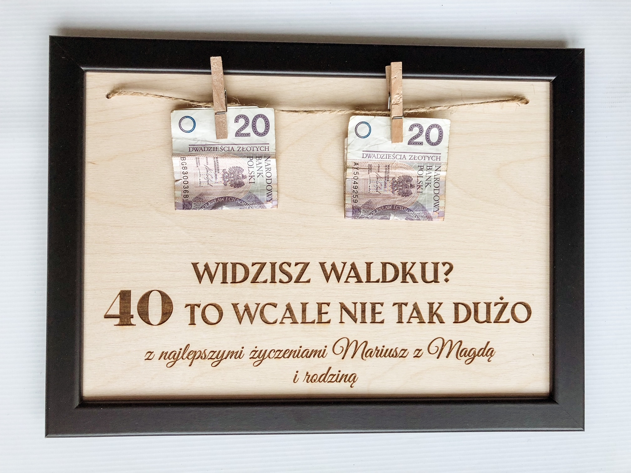 Drewniana ramka z grawerem to z pewnością zaskakujący oraz oryginalny prezent na urodziny. Na sznurku jutowym zawieszoną są klamerki, dzięki którym można zawiesić pieniądze. Banknoty widoczna na zdjęciu nie są elementem zestawu 🙂