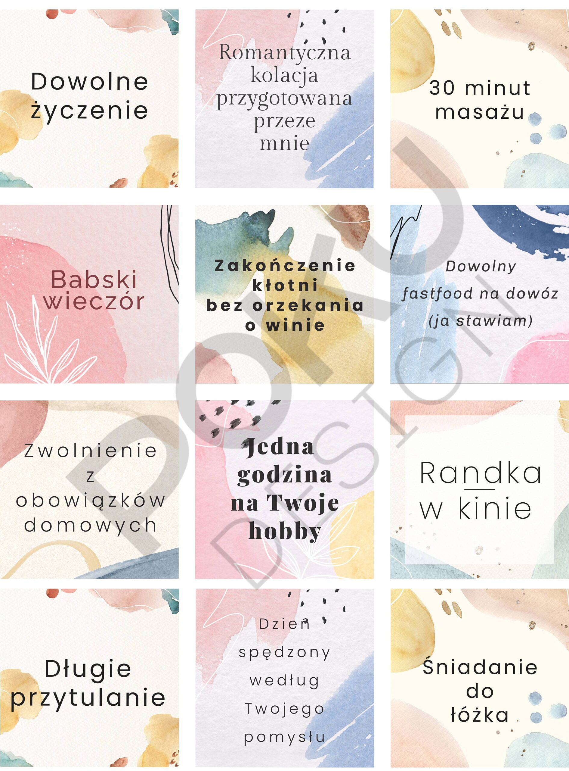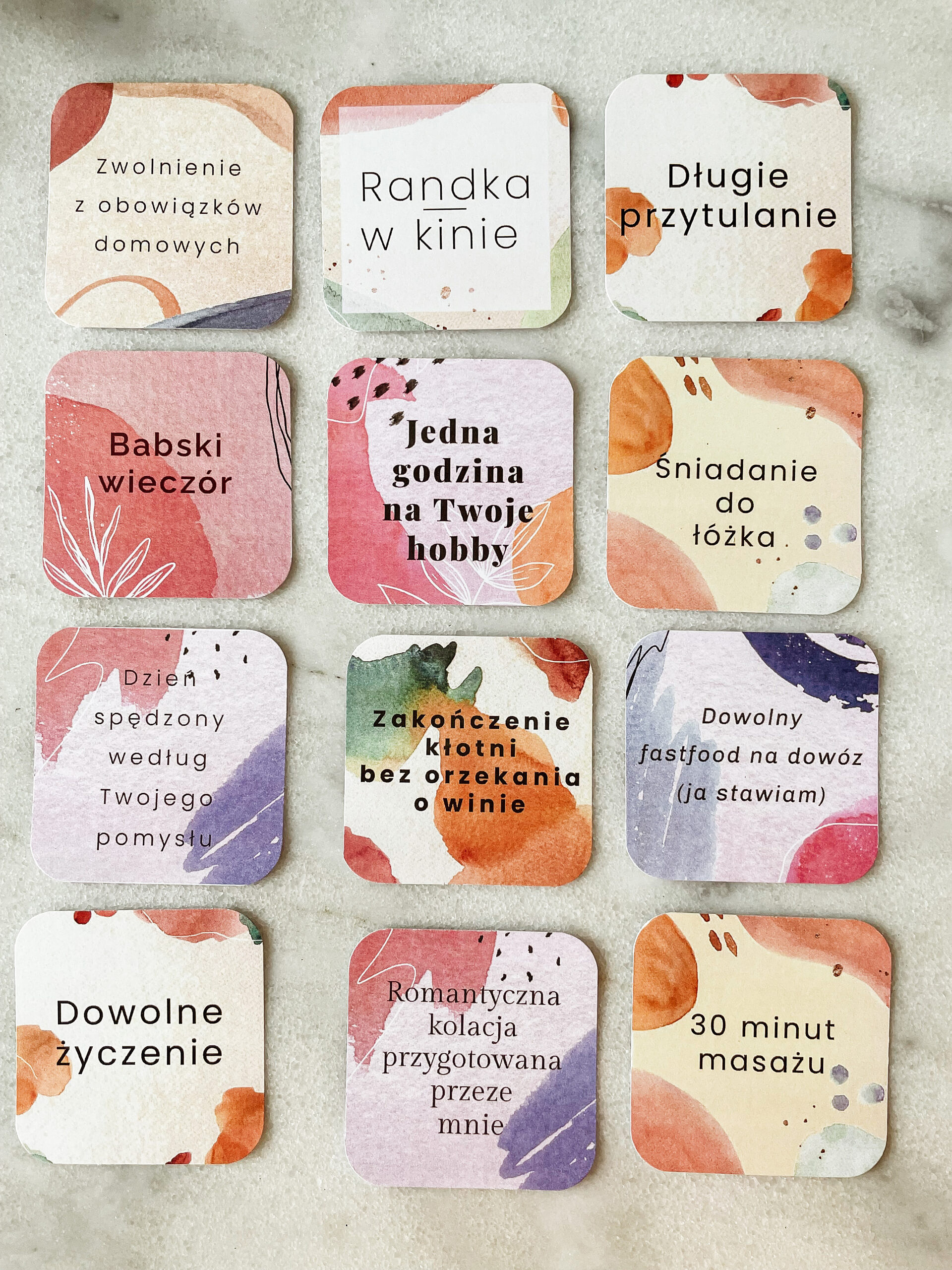Nasz zestaw składa się z 12 kartek, a nie 20 czy 30 z myślą o osobie, która będziemy musiała te wszystkie życzenia spełnić 😉