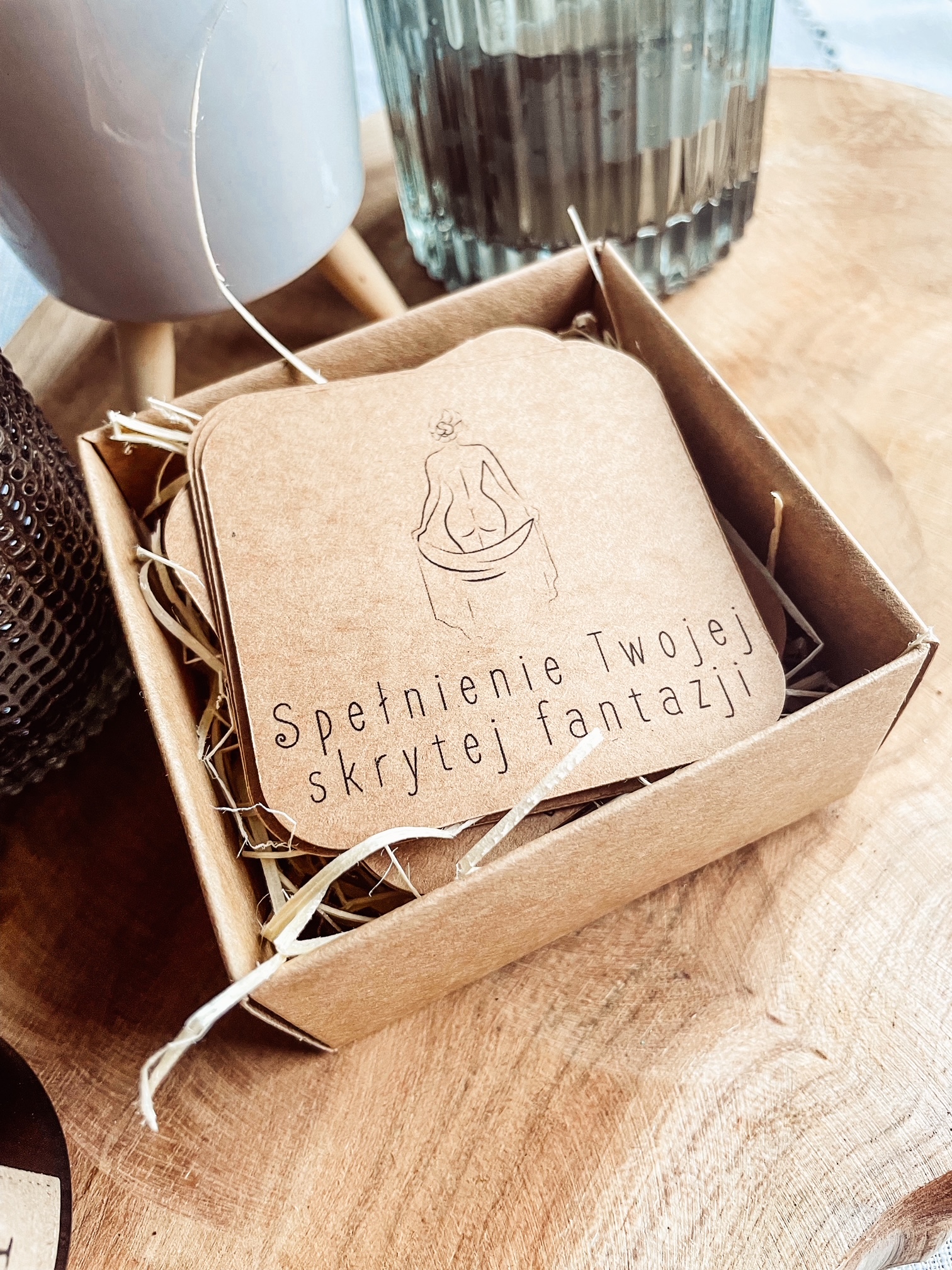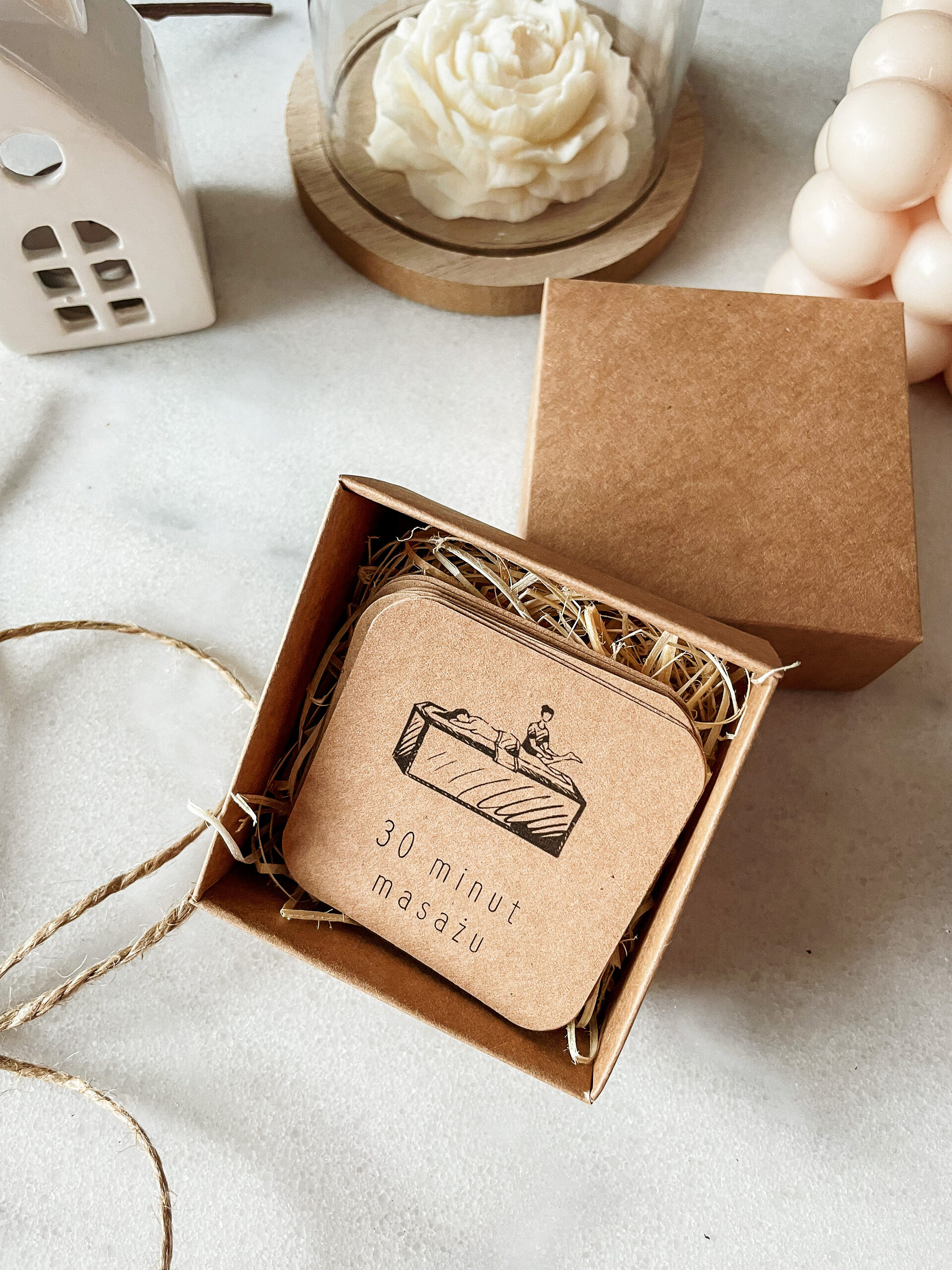 Kupony pakowane są w gustowne, ekologiczne pudełko ze sznurkiem. W środku znajduje się ozdobna wełna drzewna i serduszko. Otrzymujesz prezent gotowy do wręczenia – nie musisz martwić się o pakowanie! Idealny na Walentynki, Dzień Kobiet, Urodziny czy Rocznicę.
