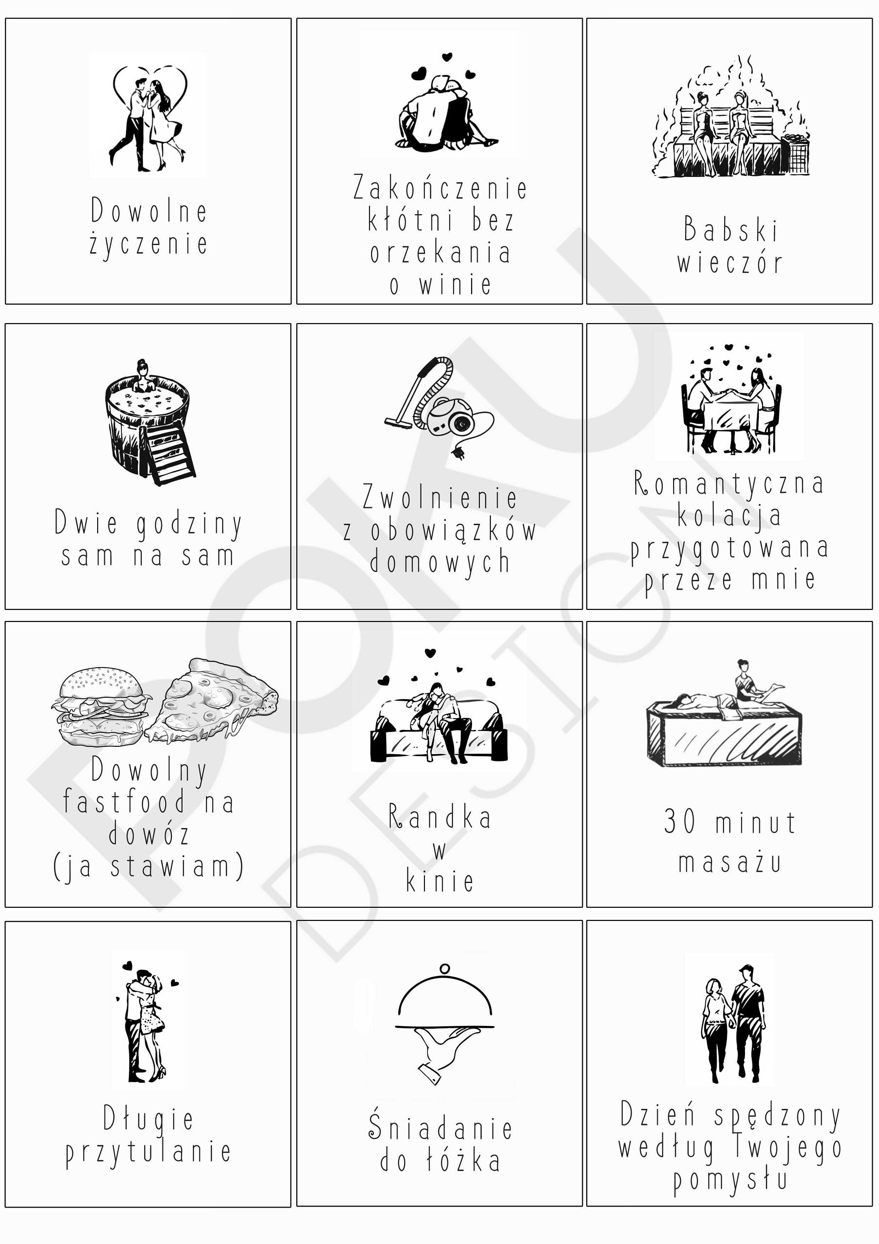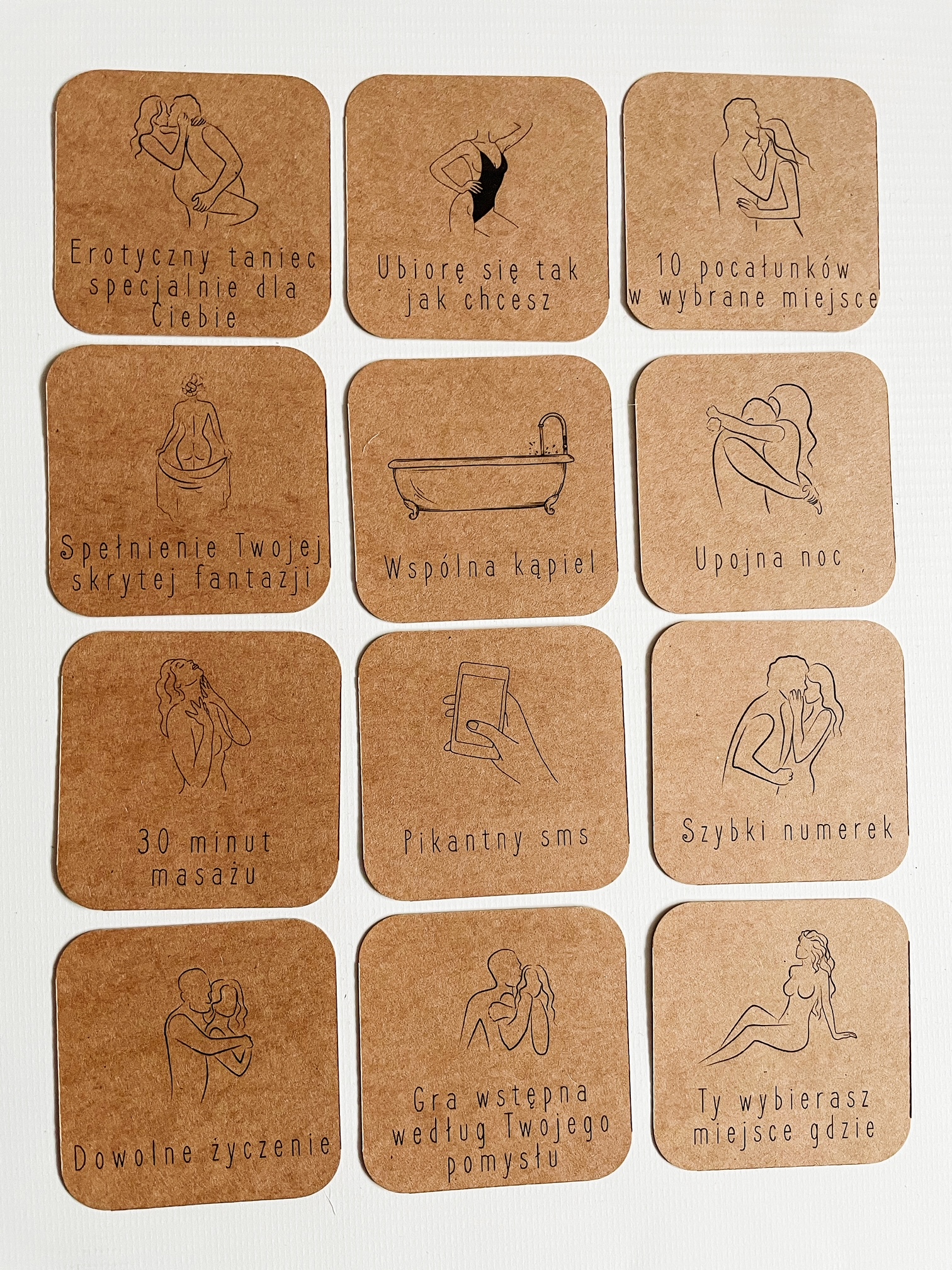Zestaw składa się z 12 kart, które Twoja wybranka może wykorzystać w dowolnym momencie. To Ty będziesz dżinem, który spełnia te życzenia! 😉